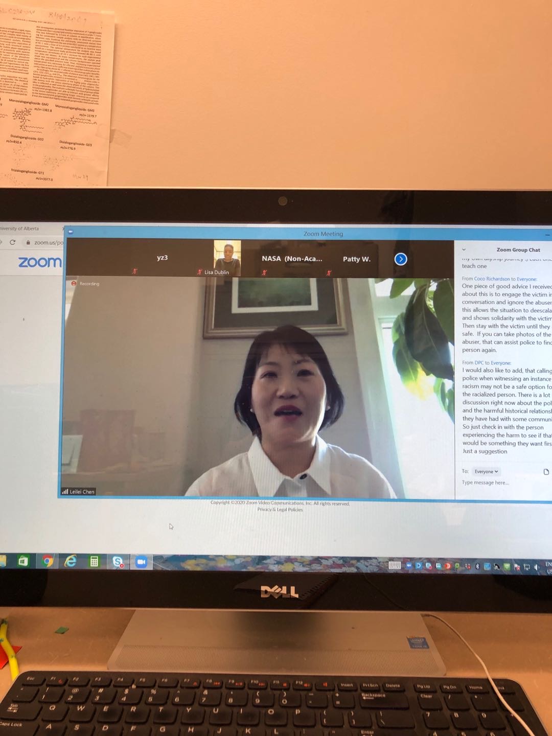埃德蒙顿加中友好协会理事陈蕾蕾博士受阿尔伯塔大学行政职工协会(NASA,Non-Academic Staff Association)邀请,为其成员讲述应如何看待北美范围内因新冠状病毒引发的对华人 的种族歧视的社会现象。此次活动是NASA的“平等、多元和包容委员会”组织的在线“午餐和学习”系列活动之一。有100多名成员报名参加此次活动。
