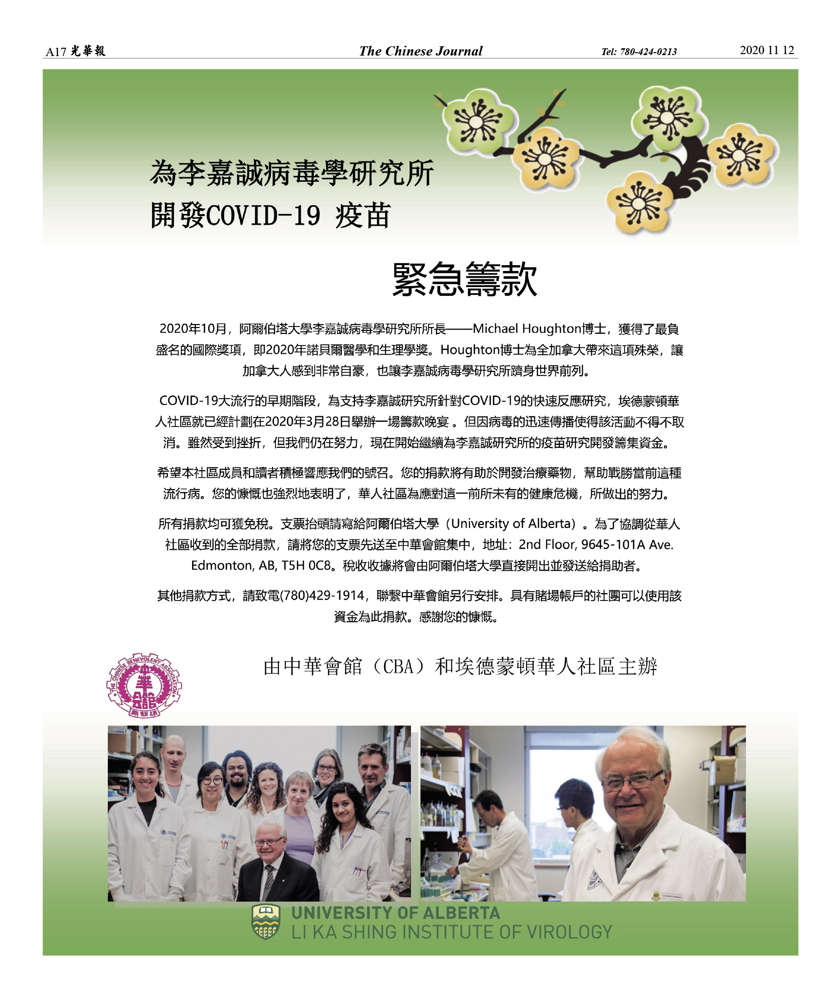 我会积极响应中华会馆和本市华人社团联合主办的“开发新冠疫苗“筹款活动,为支持加拿大阿尔伯塔大学李嘉诚病毒学研究所(Li Ka Shing Institute of Virology University of Alberta) 对新冠病毒的研究出一份力。