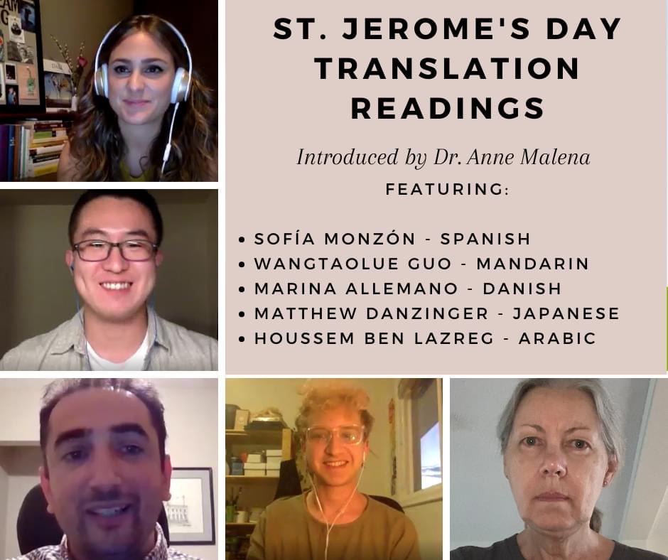 2020年9月30日,加拿大文学翻译家协会(Literary Translators’ Association of Canada)和阿尔伯塔大学现代语言和文化研究系(Modern Languages and Cultural Studies)联合举办“世界翻译日”线上庆祝活动。活动有两个内容,一是“翻译聚光灯”(Spotlight on Translation),二是“圣杰罗姆日翻译作品朗读”。“翻译聚光灯”是加拿大文学翻译家协会承办的国家级翻译庆典活动,向大众介绍加拿大优秀的文学翻译作品。