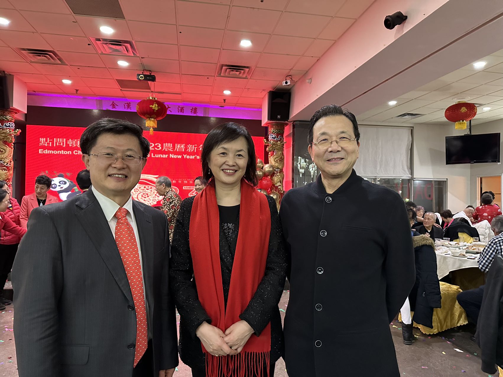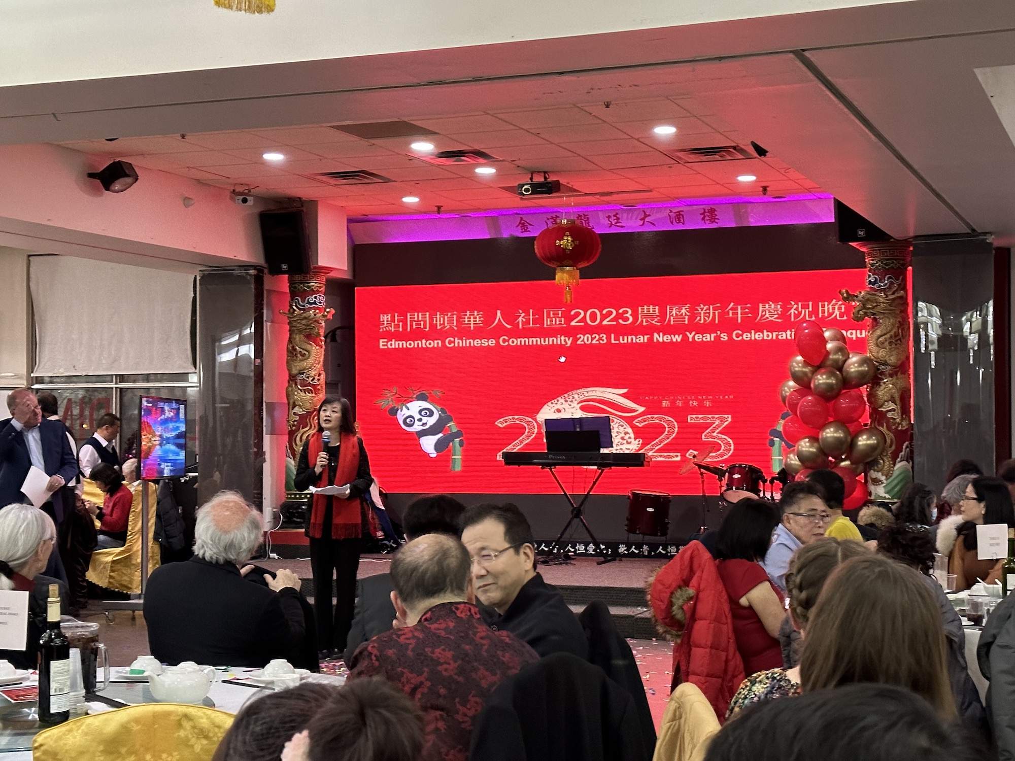 2023年1月28日,我会会长马君强,执行会长迟文荣,副会长马麟,田屹,韩子鸿和理事马文驰,赵振祥一同代表埃德蒙顿加中友好协会于埃德蒙顿华人社区一起庆祝中国新春佳节和新年庆祝晚宴。新任驻卡尔加里总领馆赵丽莹总领事、阿尔伯塔省副省长马杜、埃德蒙顿市议员Jennifer Rice也莅临此次盛典,与埃德蒙顿全体华人共同庆祝农历兔年的到来!