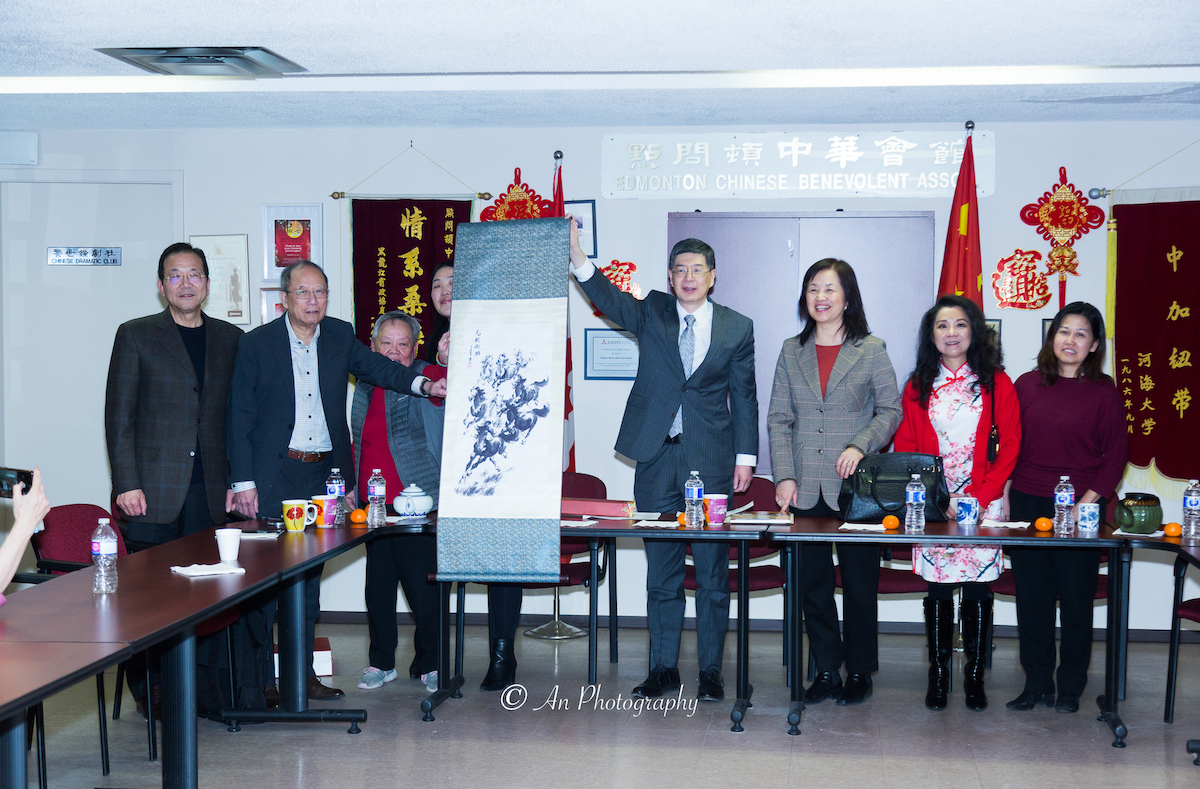 见面会最后,丛培武大使和赵丽莹总领事赠送给华人社区一幅《马到成功》水墨画。寓意著祝愿埃德蒙顿华人社区在新的一年里取得更大的成就和成功。也象征着勇往直前、马到成功的精神,激励著华人社区在加拿大这片土地上追求梦想、创造辉煌。