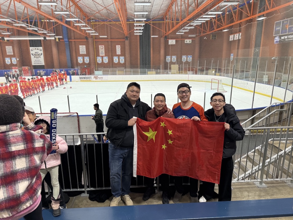 作为中加民间体育文化交流的积极推动者,我会副会长田屹来到比赛现场,与现场的加中球迷一道,为中国男子国家冰球队送上热烈的加油与支持。在赛场氛围中,田屹副会长与社区成员互动交流,共同感受比赛激情与体育精神。