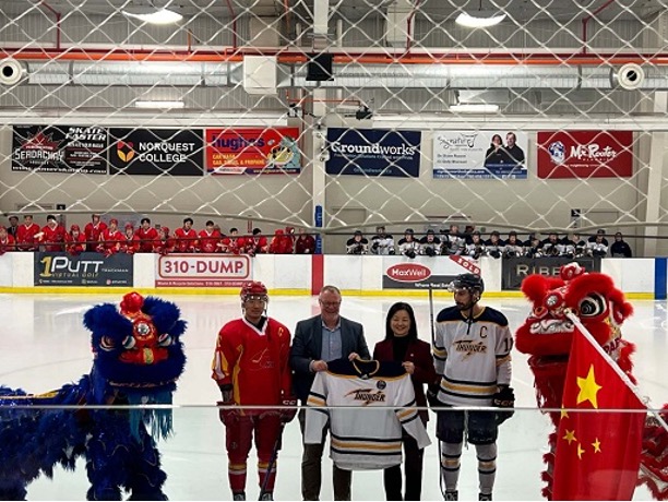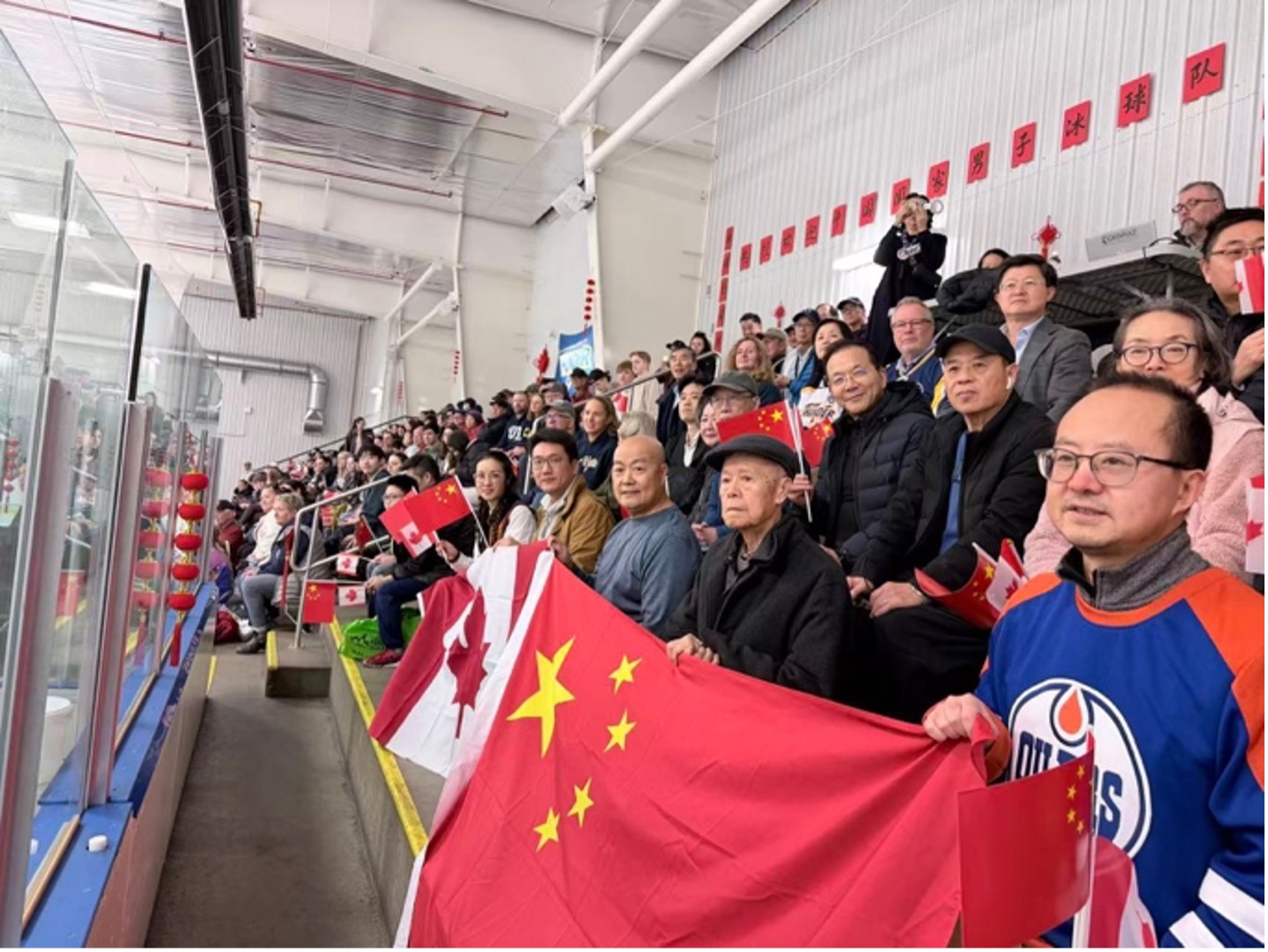 埃德蒙顿,2026 年 2 月 5 日 — 由中国男子国家冰球队对阵 Concordia University of Edmonton Thunder (埃德蒙顿康考迪亚大学雷霆冰球队) 的友谊赛在 Clareview Arena 隆重举行。作为中加民间友好交流的重要推动者,我会马麟会长、副会长梁立军Philip Leung也与现场的加中两国球迷一道,共同见证了这场精彩的比赛,为中国冰球队送上热烈加油与支持。
