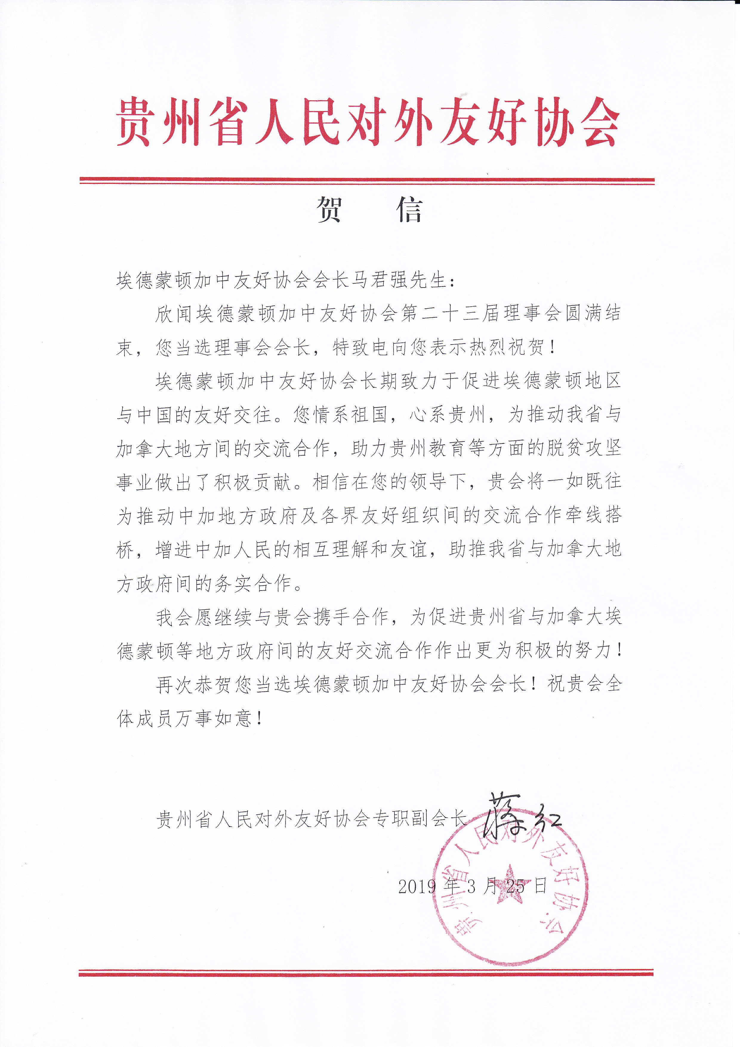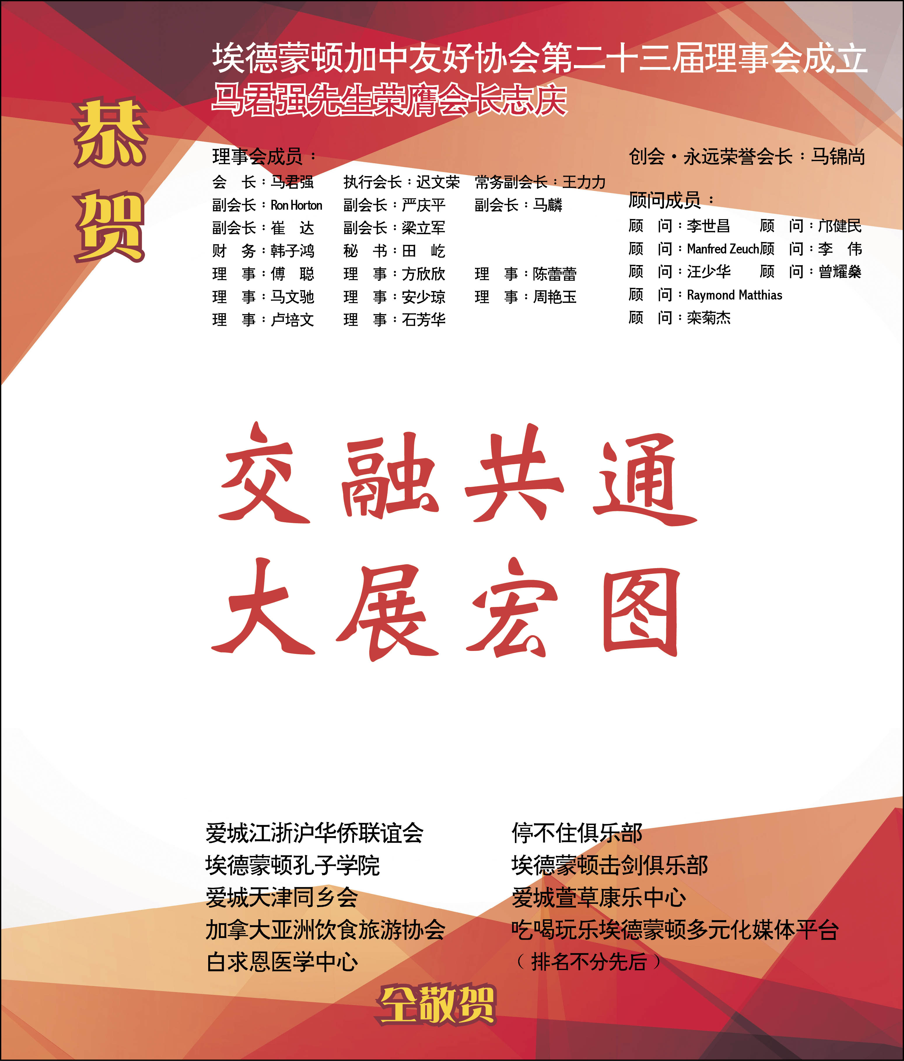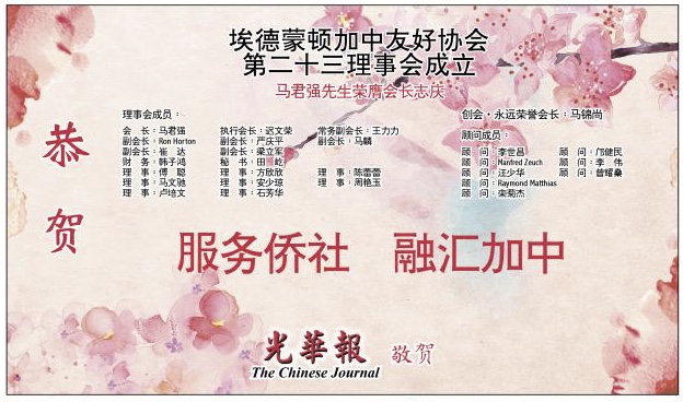 埃德蒙顿加中友好协会第二十二届理事会任满,于二零一九年三月十七日召开年会,通过协商选举一致通过,第二十三届理事会产生。马君强先生当选本会第二十三届会长