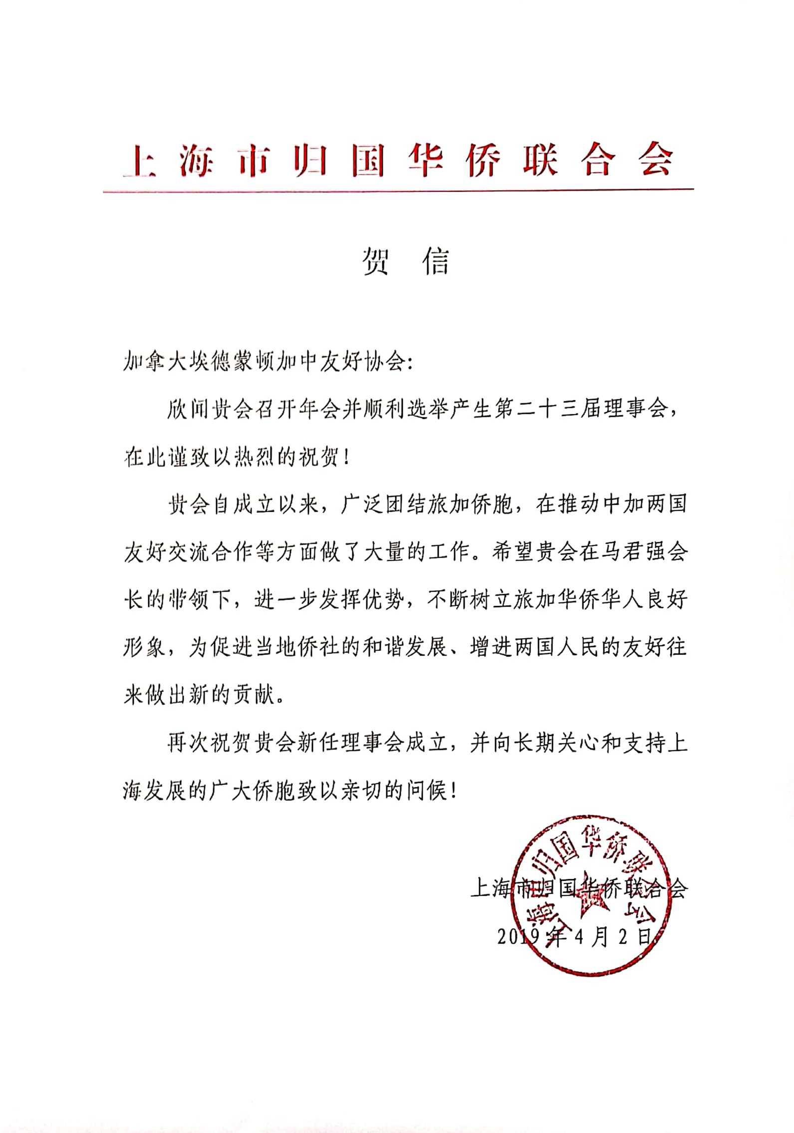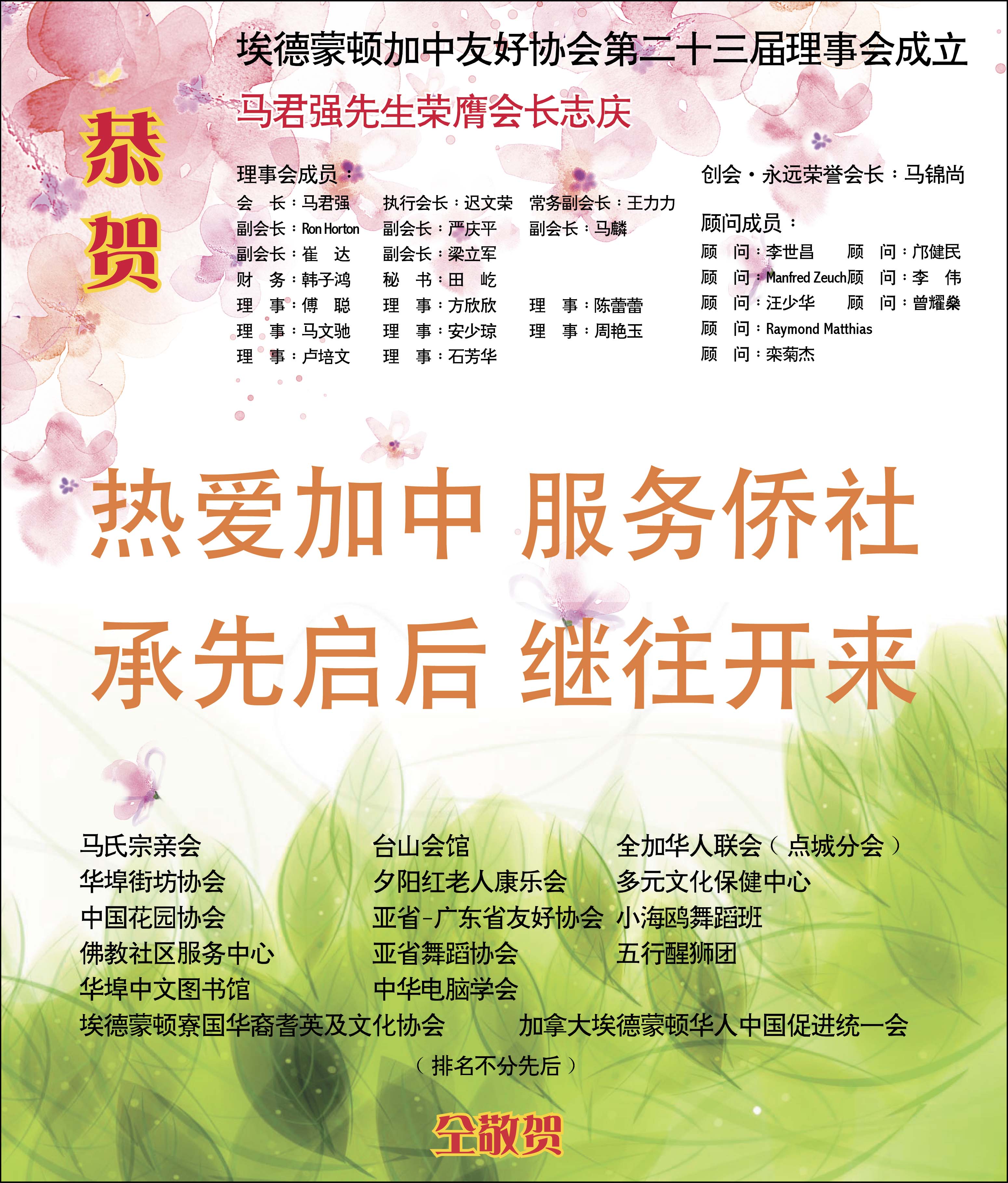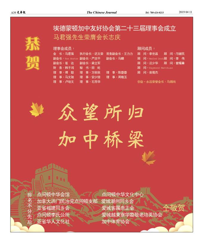 埃德蒙顿加中友好协会第二十二届理事会任满,于二零一九年三月十七日召开年会,通过协商选举一致通过,第二十三届理事会产生。