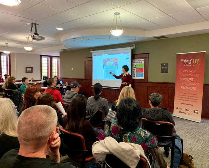 本次活动的重点“多元文化写作论坛”,尤其引人注目。其宗旨在于总结与交流写作社团怎样在加拿大多元文化的氛围里得到发展,展示各自所取得的成果,探讨面临的挑战及未来进一步发展的计划。四位发言者分别是爱城笔友会的创立者、前任会长刘全艳女士,现任会长周艳玉博士,阿尔伯塔作家协会理事会成员Lisa Mulrooney 女士及麦科文大学学生写作社团Bolo Tie Collective的Ashley Bilodeau 女士。周博士在论坛中做了“作家成长乐园”的主题演讲,她和笔友会创办者、前任会长刘全艳女士一起,在论坛中共同回顾了爱城笔友会成长的历程和所取得的成就,以累累的硕果,在加中友谊交融中,庆祝了爱城笔友会的生日。